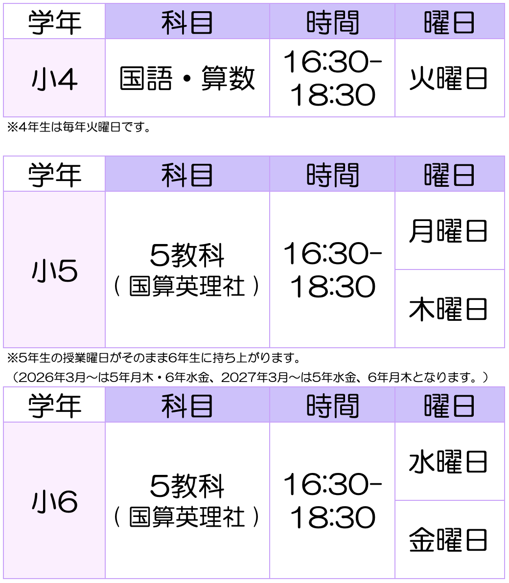 小学生クラス 授業について 1学年12名までの集団指導 当塾は1学年12名までの集団指導です。授業時間は16:30〜18:30です。公立中学校に進学する生徒を対象に授業を行っています(中学受験塾ではありません)。授業を行う上で、常に意識していることは「中学校に進学してから、勉強に困らないようになること」です。小学生の学習範囲を教えることはもちろん、中学校で習う範囲も授業中に扱います。 先取り学習 小4から授業がスタートし、小5・小6では1学年ほど先取りをして授業を行っています。年度の途中で入る場合は、最初の3ヶ月ほど、キャッチアップに時間がかかるかもしれないです。2025年に小学生クラスから中学生クラスへ上がった生徒は、全員が前期中間テストで5教科420点以上を取っています。 OKUNO塾の特徴 授業がない日もコツコツ勉強 授業がある日も授業がない日も毎日宿題が出ます。1日の勉強時間は30分もかかりませんが、とにかく毎日継続して学力UPを図ります。 中学校の勉強内容を意識した指導 中学生クラスを担当する先生が小学生クラスも教えます。そのため、小学生のうちから中学の勉強内容を意識して授業を行っています。算数は小5のうちに中1の正負の数まで進み、英語や理科なども小5のうちに中1の内容に入ります。 ゴールは高校受験 中学受験をしない小学生を対象にしていますので、小中6年間でカリキュラムを組んでいます。ゴールは高校受験です。最終的に、高校受験で志望校に合格できるよう、学力を上げていきます。そのために、まずは学習習慣を身につけることが重要です。毎日の宿題もただ出すだけでなく、毎回の授業で必ず先生のチェックがあります。 授業料 小4授業料 小5授業料 小6授業料 オプション授業(土曜日クラス)を受講される場合は、表に記載の費用に加え土曜日クラス利用料がかかります。 ※こちらに記載の費用で全てとなります。 オプション授業 土曜日クラス(個別指導) 土曜日の13:00-16:00の時間帯で土曜日クラスを実施しています。土曜日クラスでは、通常の集団授業とは異なり、個別指導となります。時間内であれば、好きな時間に入退室が可能なので、3時間いてもいいですし、自分の勉強が終わったら1.5時間で帰っても大丈夫です。科目は国語、算数、英語、理科、社会の最大5つです。生徒のレベルや目的に合わせて先生が教材を選びます。中学の勉強を先取りしたい場合は、中学生向けの教材を渡しすることも可能です。 通常授業についていけない場合や、年度の途中から入塾する場合は、土曜日クラスを活用して追いついてほしいと思います。土曜日クラス利用料:月額4,400円 入塾の流れ 個別面談 入塾をご検討の方は、OKUNO塾公式LINEより個別面談のご予約をお願いいたします。個別面談では、費用や実際に使用している教材などについてご説明いたします。 体験授業 無料体験授業は2回です。ご希望であれば土曜日授業も体験可能です。 お手続き 入塾を希望される場合は、再度当塾にお越しください。お手続きを行います。 よくある質問 通われている生徒さんについて教えてください。 勉強が得意なお子さんが多い印象です。もともと「くもん」に通っていた生徒が全体の半数以上を占めます。その他、中学受験塾を辞め、当塾に来る生徒さんも全体の2割ほどいます。 毎日宿題があるのですか? あります。授業がない日も毎日行ってもらう宿題は英単語・計算問題・漢字です。次の授業までに行ってくる宿題は国語の読解問題、英語の文法問題、算数ワークです。1日あたりの宿題量は15分ほどです。なお宿題を忘れる日が続く場合は、申し訳ありませんが退塾となります。 5年生から6年生になると、曜日は変わりますか? 4年生から5年生へ上がるときは曜日の変更がありますが、5年生から6年生に上がるときは、曜日の変更はございません。 駐輪場はありますか? 大変申し訳ありませんが、駐輪場はございません。お手数ですが、武蔵新城駅の有料駐輪場をご利用ください。 自動的に中学生クラスに上がれますか? いいえ。中学生クラスに上がれる条件は、進級テスト(国算英)に合格すること、宿題を毎回こなしていることの2つです。進級テストは6年生の1月末に行い、合格基準以上の点数を取れば合格です。なお、過去に落ちた生徒は1人もいないので、よほどのことがない限りは落ちません。 土曜日クラスは取った方が良いですか? 土曜日クラスは個別指導ですので、生徒の学力に合わせた指導ができます。テキストも一人一人の学力を見て決めています。「もっと先取りをしたい!」逆に、「前の学年の復習をしたい!」といったご要望がある場合は、受講をおすすめします。通常授業についていけない場合や入塾したばかりで先取り単元がわからない場合は、基本的には土曜日クラスで追いつけるようにしていただきます。
